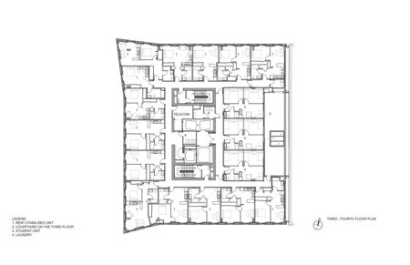 Housing equity is a focus of the project. Student housing suites and common-area spaces for students and faculty are dispersed throughout the twelve-story building, providing housing for music students in the heart of the arts district, while 27 rent-stabilized apartments replace units from the site’s previous building. The base of the new building is lined with highly transparent low-iron glass to visually reveal the creative activities occurring within, to draw the public in to hundreds of free performances each year. The central lobby is a porous, community-oriented entrance to the ground floor, which is anchored by three major programmatic spaces – a café, an informal student lounge, and a glass-enclosed recital hall – all visually accessible to passersby. On the top floor, a double-height performance space cantilevers over Van Ness Avenue, making a visual connection across the street to Davies Symphony Hall and the iconic dome of City Hall.