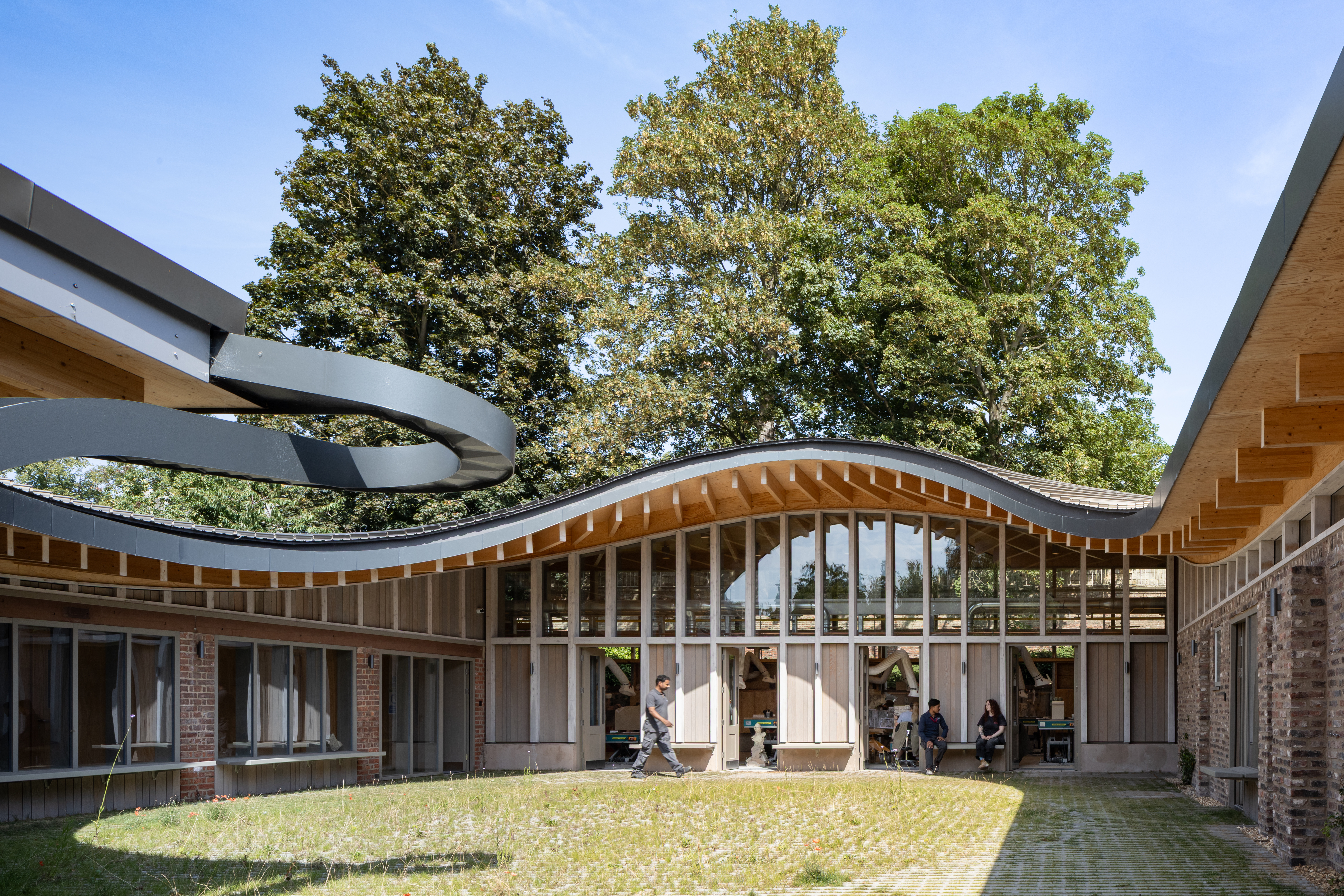 Porous Campus Connecting Industry to Education Positioned between the main campus and the native forest arboretum, the building boasts an optimized mass timber structure with a visually striking contrast between warm wood tones inside and charred wood siding outside. Notable features, such as the multicultural lounge, glass-clad stai...