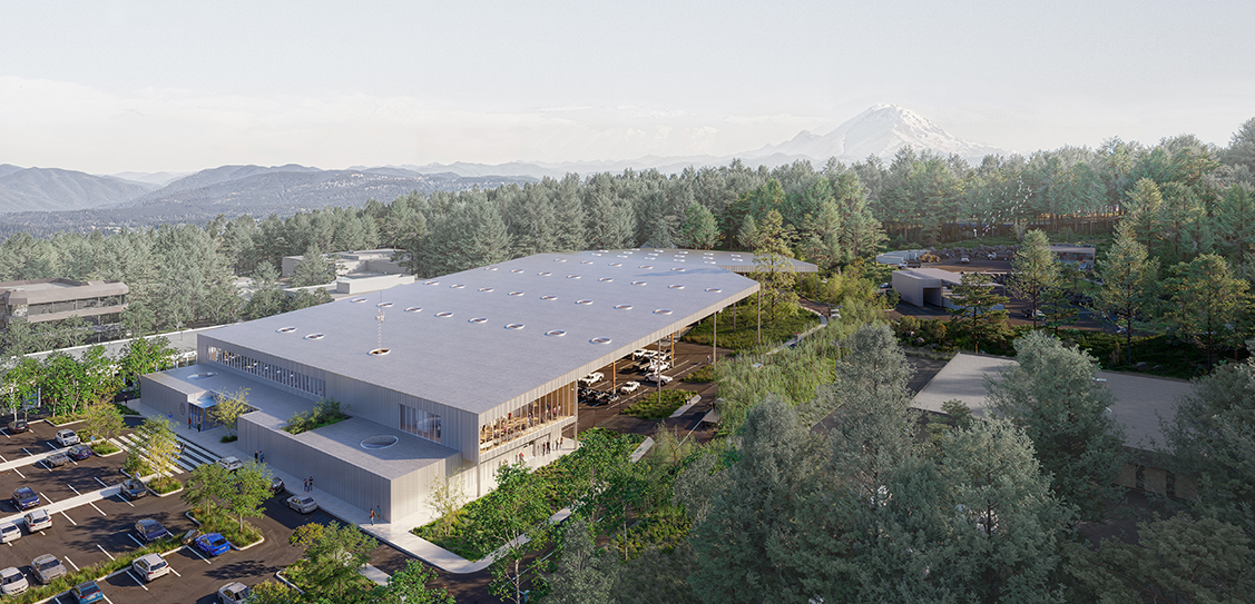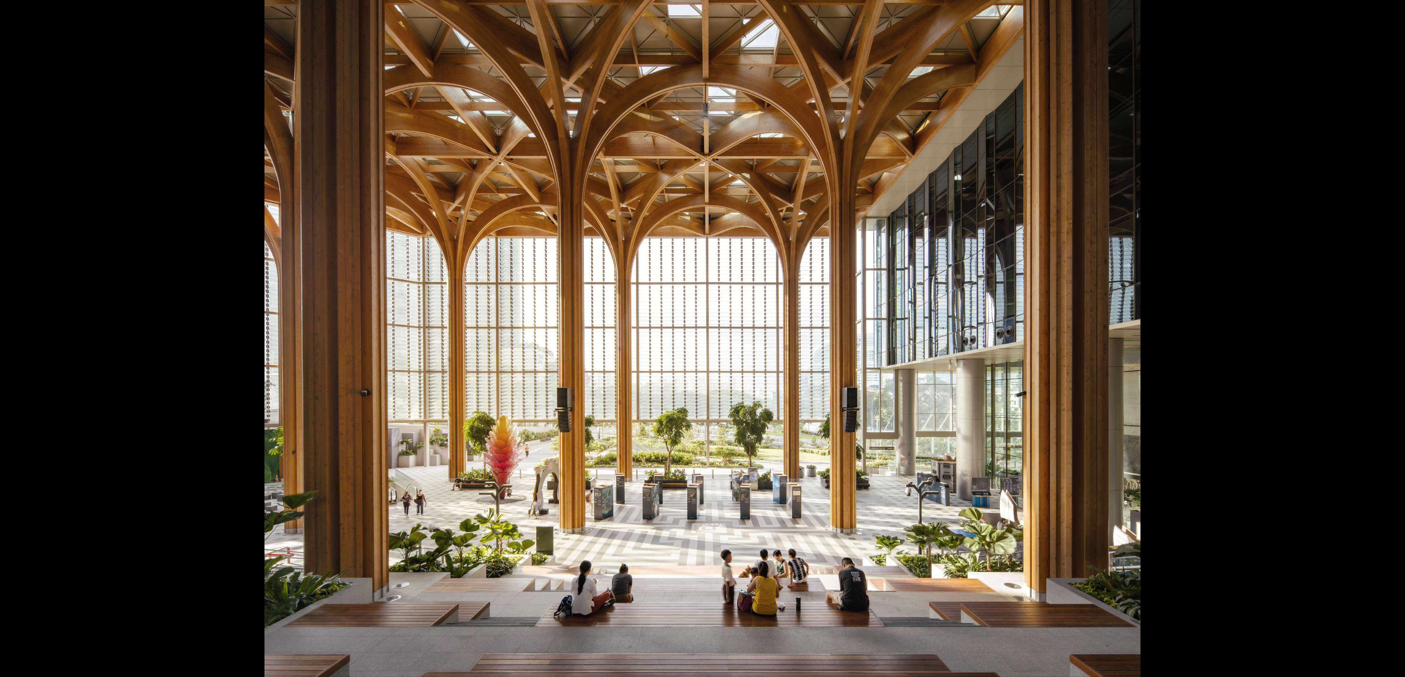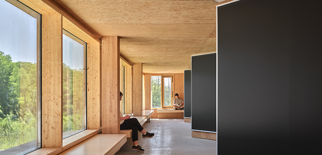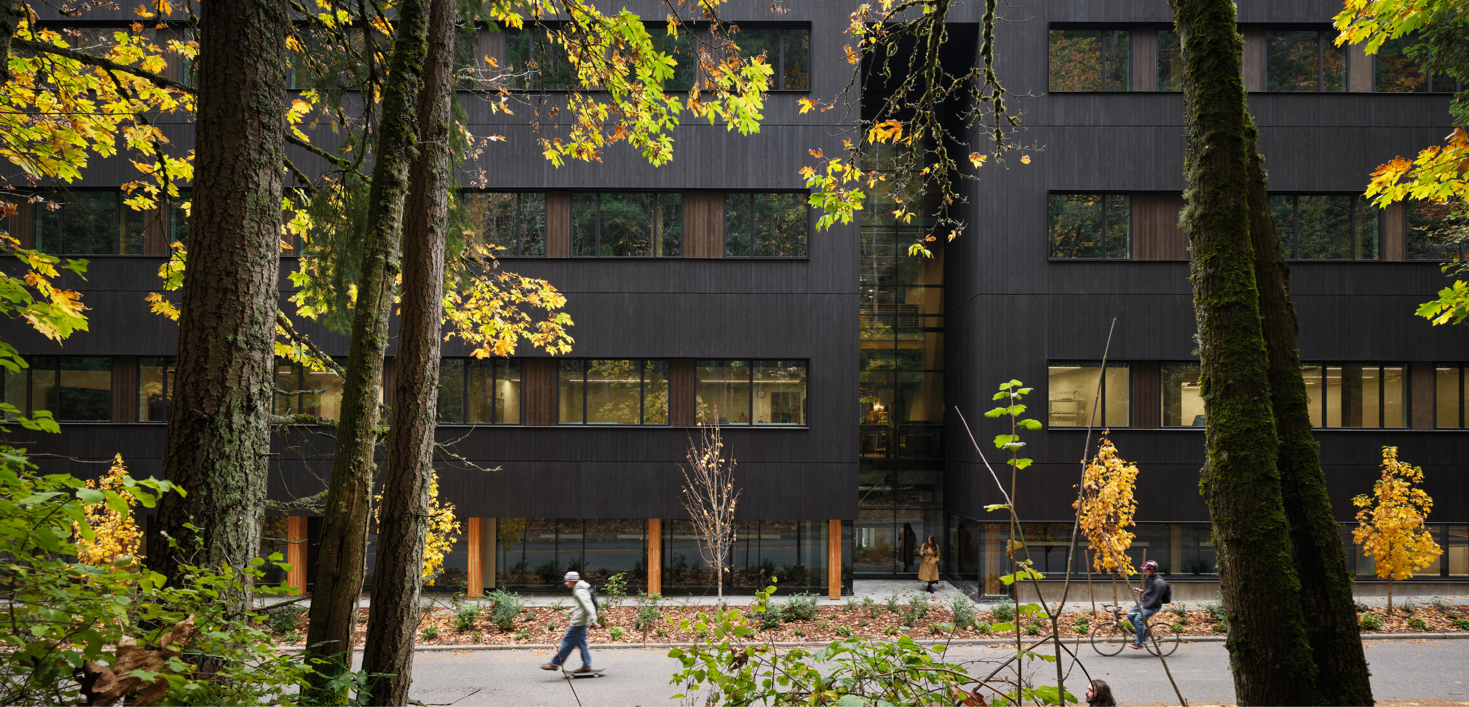 Porous Campus Connecting Industry to Education Positioned between the main campus and the native forest arboretum, the building boasts an optimized mass timber structure with a visually striking contrast between warm wood tones inside and charred wood siding outside. Notable features, such as the multicultural lounge, glass-clad stai...