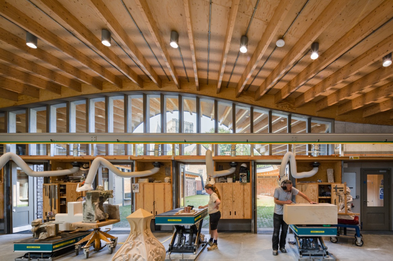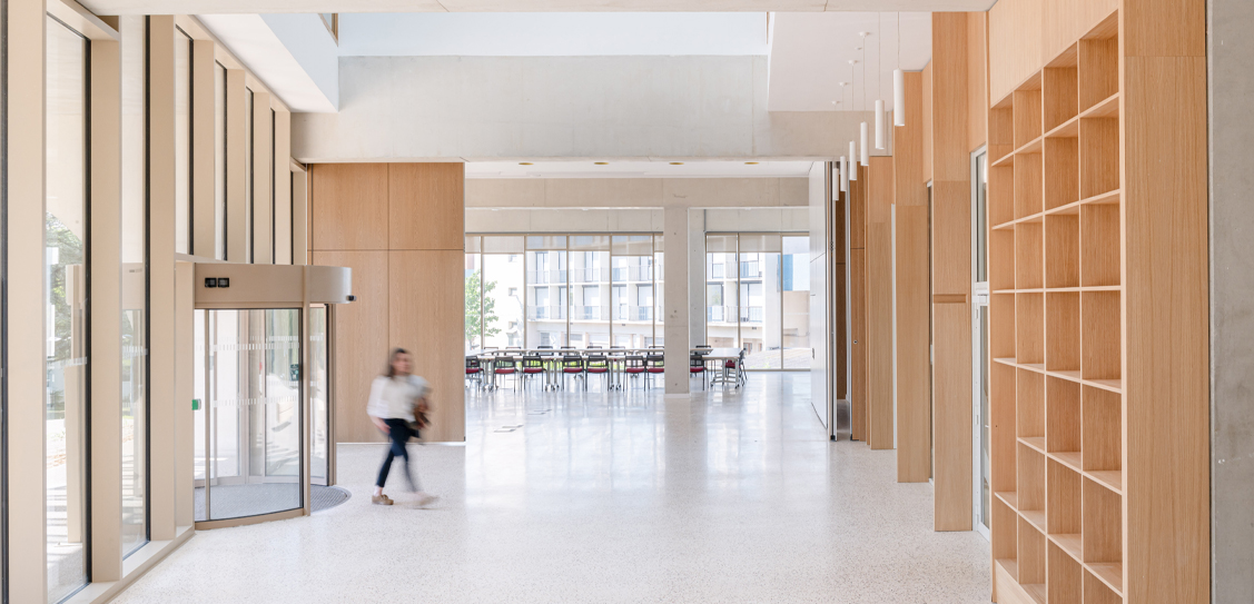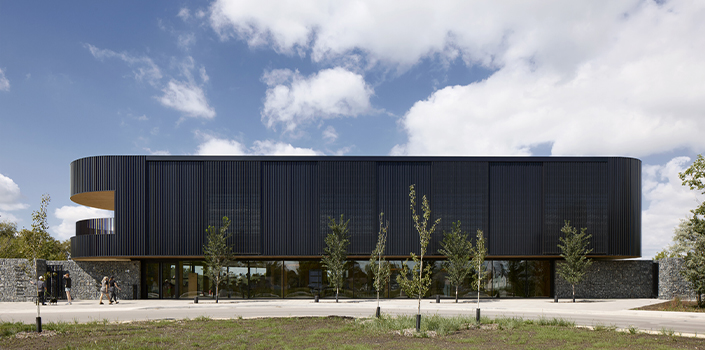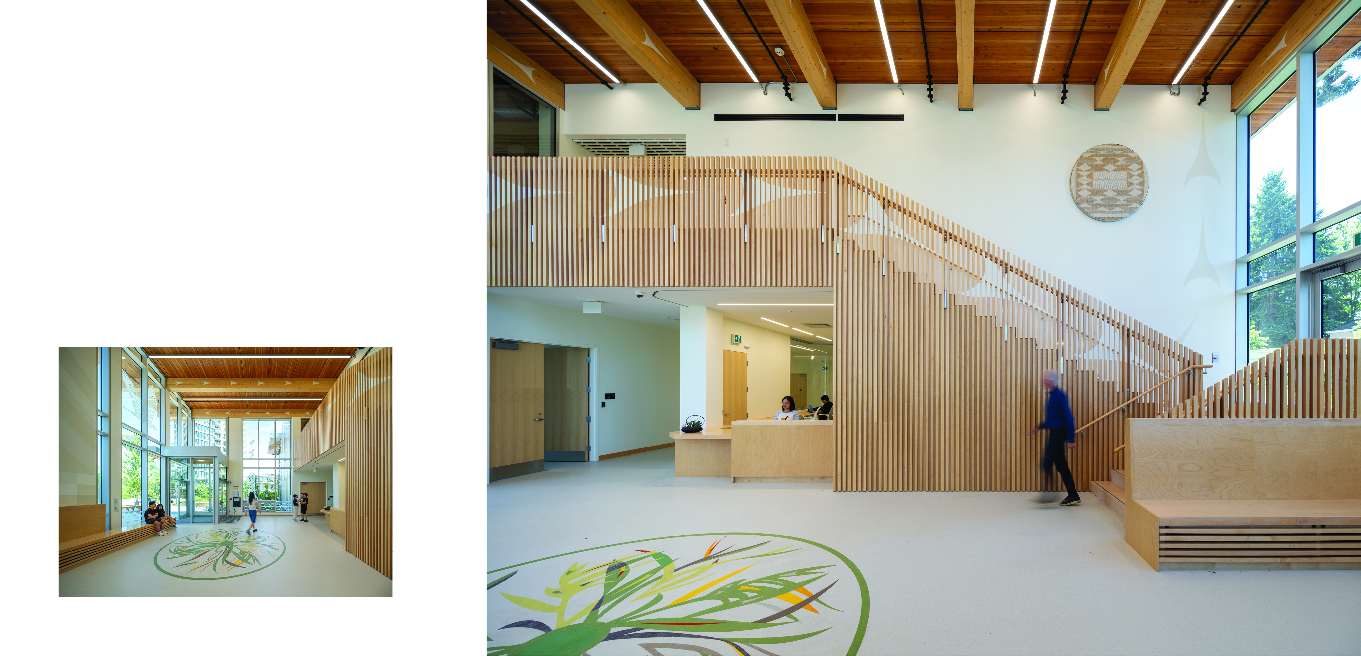 Porous Campus Connecting Industry to Education Positioned between the main campus and the native forest arboretum, the building boasts an optimized mass timber structure with a visually striking contrast between warm wood tones inside and charred wood siding outside. Notable features, such as the multicultural lounge, glass-clad stai...